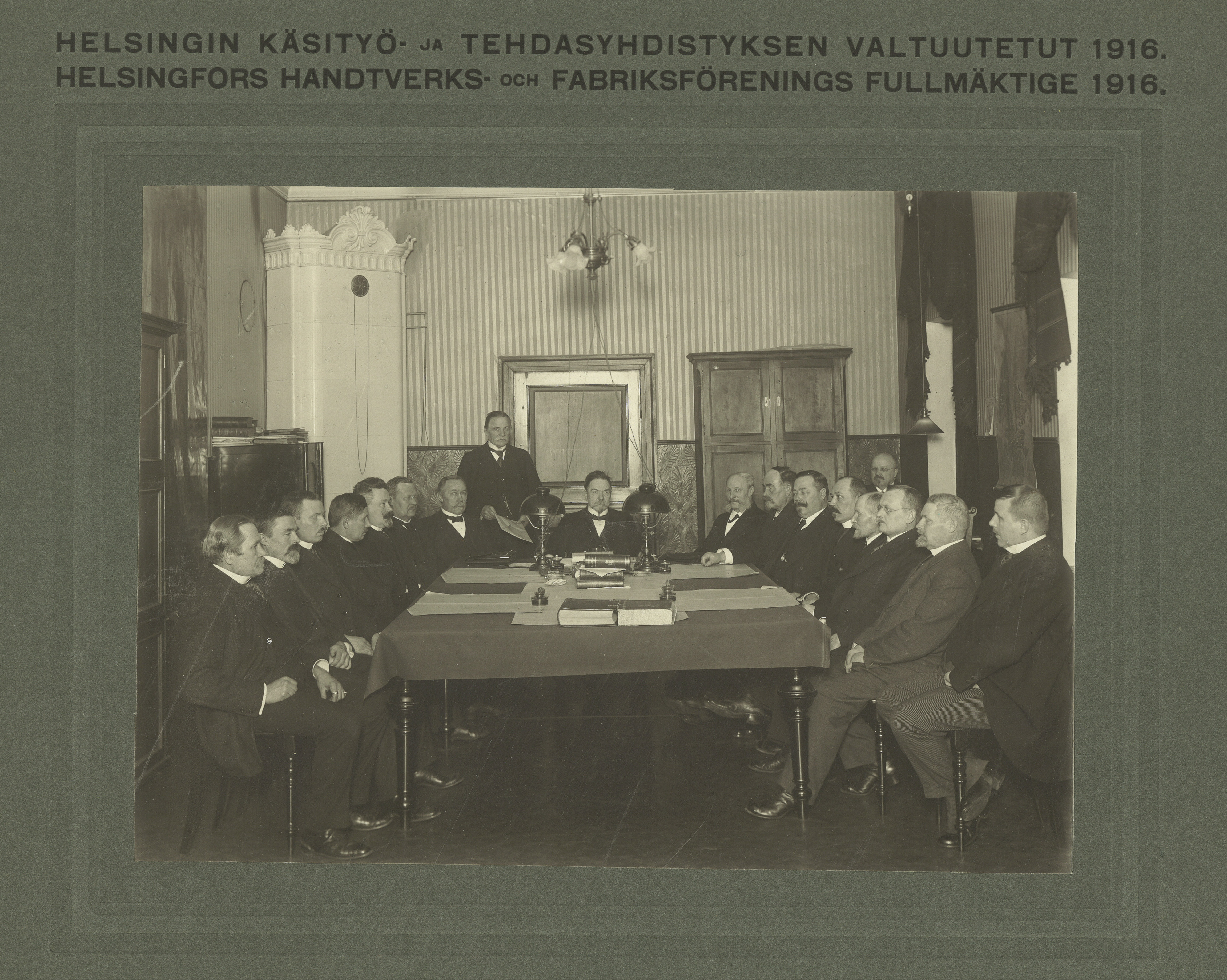 Tässä vertailun vuoksi yhdistyksen valtuuston muotokuva vuodelta 1916, pöydän päässä puheenjohtajan paikalla Viktor Julius Von Wright. Tuolloin valtuutettuja oli 16, ja kaikki olivat miehiä. Paljon on muuttunut 102 vuodessa, vaikka yhdistyksen tehtävä onkin pysynyt samana jo vuodesta 1868.